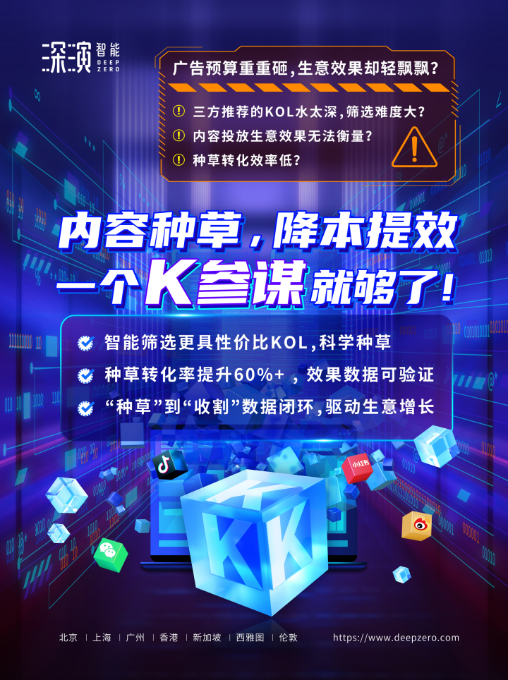 人生就是博智能K参谋科学前选,可跨领域找到最能影响品牌目标TA人群的KOL进行投放,同时有效平衡投资回报率;内容营销数据可同电商后链路平台打通,进行数据归因分析,准确判断KOL影响的用户是否真实在电商平台产生购买行为;实现“种草”到“收割”链路闭环,轻松内容营销,可根据品牌方的业务需求提供一站式的KOL采买及数据验证服务,有利提升整体内容营销的效率与效果。